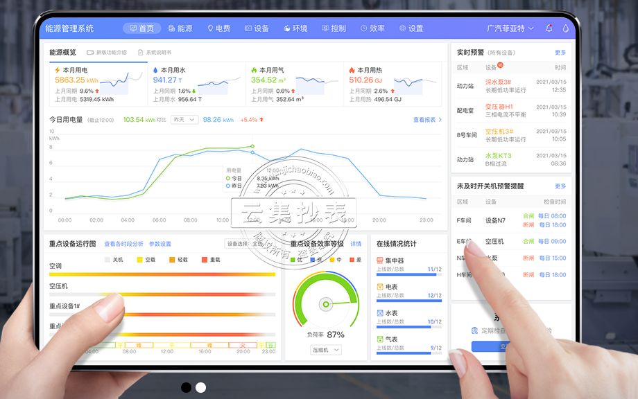 1、精準(zhǔn)的統(tǒng)計(jì)出水、電等分類(lèi)能耗用能和綜合能耗,系統(tǒng)以曲線圖形展現(xiàn)各類(lèi)能耗的消耗趨勢(shì),便于管理方實(shí)時(shí)掌控能源消耗情況。