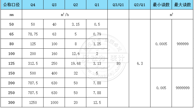 不同的應(yīng)用場景中水流量的大小不同,以社為/捷先遠(yuǎn)傳大口徑水表為例,水表尺寸有50mm~300mm可選,不同口徑大小則對應(yīng)了不同的最小流量(Q1)、分界流量(Q2)、常用流量(Q3)以及過載流量(Q4)等,表示該口徑可以測量該范圍的用水量,如:DN50大口徑水表Q1=0.50m³/h、Q2=3.15m³/h、Q3=40m³/h、Q4=50m³/h。